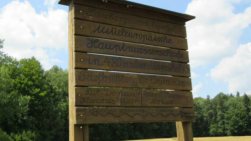 Auf einer absolut ruhigen Nebenstraße vorbei an Schönlind und die letzte Steigung hinauf auf 480 m Höhe und die Kuppe der Wasserscheide war erreicht. Auf der Kuppe der europäischen Haupt-Wasserscheide ist zur Information eine Holztafel aufgestellt. Danach ging es auf sehr guten Wegen nur abwärts. |