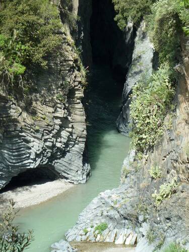 Gole dell' Alcantaran - Die Schlucht befindet sich im Alcantara-Tal, das in der Nähe des Ätnagebietes liegt. Die Alcantara-Schlucht ist ein beeindruckendes, natürliches Kunstwerk. Entstanden als vor Tausenden von Jahren das Flussbett von den Lavaströmen des Ätna blockiert wurde. Da die Lava sich durch das Wasser viel schneller abkühlte, bildeten sich Säulen. Über Jahrtausende hinweg bahnte sich der Fluss einen Weg durch diese Säulen, wodurch die beeindruckende Schlucht entstand.Die Schlucht ist bis zu 25 m hoch und hat eine Breite von meistens 4-5 m, aber an den schmalsten Stellen nur 2 Meter. Das Lavagestein ist eines der charakteristischsten Merkmale der Schlucht. In den Monaten in denen nicht zuviel Wasser den Fluss entlang fließt kann man die Schlucht durchwandern. Tief in der Schlucht kann man viele faszinierende, natürliche Formationen entdecken.